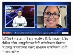 আগামী ২৪ শে জুন মঙ্গলবার সর্বোচ্চ তাপমাত্রার মধ্যে বাংলাদেশি ভোটারদের ভোট কেন্দ্রে নিয়ে যাওয়াই নিউইয়র্ক সিটি কাউন্সিল নির্বাচনে শাহানা হানিফের জন্য এখন সবচেয়ে বড় চ্যালেঞ্জ হয়ে দাঁড়িয়েছে। ১৮ই জুন নিউইয়র্ক সহ আমেরিকার জনপ্রিয় টিভি চ্যানেল, টাইম টিভির টাইম এক্সক্লুসিভের এক আলোচনা সভায় আলোচকরা এই আশঙ্কা প্রকাশ করেন।