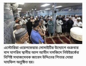 এস্টোরিয়া ওয়েলফেয়ার সোসাইটি শুক্রবার (২৭ জুন) বাদ মাগরিব স্থানীয় আল আমীন মসজিদে এই অনুষ্ঠানের আয়োজন করে। মাহফিল ও দোয়া পরিচালনা করেন আল আমীন মসজিদের ইমাম হাফিজ মাওলানা লুৎফর রহমান চৌধুরী ও মাওলানা নেসার আহমেদ।